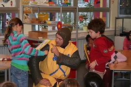 Niederbachem, 09.02.2010. Im Rahmen des Sachunterrichtes besuchte uns am 09.02.2010 ein "echter" Ritter. Herr Bongartz - Mitarbeiter der Past Present Promotions GbR - zeigte den Kindern, wie sich ein Ritter damals kleidete. Ein Kettenhemd durften die Kinder versuchen hochzuheben, was sich als sehr schwer erwies. "Aus wie vielen Ösen besteht eigentlich so ein Kettenhemd" und warum trug man es überhaupt?" Diese und viele andere Fragen konnte Herr Bongartz den Kindern beantworten. Einen richtigen Ritterhelm durften sich die Kinder aufsetzen und auch einmal das Schwert hochheben. Ein tolles Erlebnis!