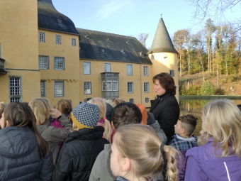 Niederbachem, 31.10.2012. Am Mittwoch, dem 31.10.2012 fuhren die Klassen 3a und 3b mit dem Bus nach Villip zur Burg Gudenau. Dort wurden sie von Frau Dr. Hausmanns erwartet, die ihnen viel Interessantes über die Wasserburg und das Leben auf der Burg erzählte. Der älteste Teil ist schon über 800 Jahre alt. Am besten hat den Kindern der herrliche Garten mit der Grotte gefallen. Erstaunt waren sie, dass der Garten nicht von 100 Gärtnern, wie sie geschätzt haben, sondern nur von einem einzigen Gärtner gepflegt wird. Nach dieser informativen Besichtigung der Burg verabschiedeten sich die Kinder dankend von Frau Dr. Hausmanns und fuhren weiter mit ihren Klassenlehrerinnen zur Burg Adendorf. Hier wurden sie von der Baronin von Loe begrüßt. Die Kinder durften hier in den ältesten Teil der Burg hineingehen. Frau von Loe führte sie durch einen schmalen Gang in den Gerichtssaal. Sie erklärte den Kindern wie hier Gericht gehalten wurde und wie der Verurteilte in das Verlies unter dem Gerichtssaal zur Abbüßung seiner Strafe hinabgelassen wurde. Dies war ziemlich unheimlich. In Adendorf wurden jedoch nie Todesurteile gefällt. Danach führte Frau von Loe die Kinder durch ein altes Treppenhaus in die Kapelle. Hier sangen die Chorkinder ein sehr schönes Kirchenlied. Leider war die Zeit viel zu schnell vorbei. Gerne hätten die Kinder noch mehr von der Burg gesehen. Der Bus wartete. Auf diesem Wege sagen die Kinder der Klassen 3a und 3b und ihre Klassenlehrerinnen ein herzliches Dankeschön an Frau Dr. Hausmanns und Baronin von Loe für die interessanten Führungen.