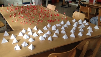 Niederbachem, 14.06.2013. Im Rahmen meiner Masterarbeit habe ich mit den Klassen 2a und 2b im Geometrieunterricht das Thema "Pyramiden" behandelt. Die Schülerinnen und Schüler haben aus Knete und Holzstäbchen Kantenmodelle hergestellt, aus Holzwürfeln eine quadratische Pyramide gebaut, Pyramiden aus Pyramidennetzen zusammengebastelt und wirklich schöne Ergebnisse erzielt. Neben der quadratischen Pyramide haben sie auch die Merkmale und Eigenschaften der Dreieckspyramide kennen gelernt.