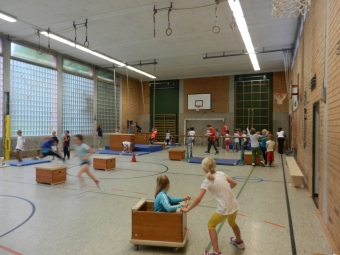 Niederbachem, 03.07.2013. Sattdessen war eine Bewegungslandschaft für die Kinder in der Turnhalle aufgebaut. Am 8.7.2013 wird der Leichtathletiktag nachgeholt. Hier können die Klassen 1 und 2 dann mit den Klassen 3 und 4 gemeinsam in das Pennenfeldstadion fahren. Die Gemeinde Wachtberg kann den Bustransfer organisieren, so dass dies kurzfristig möglich gemacht werden kann.