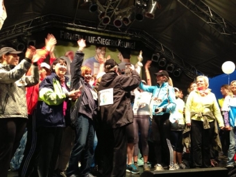 Aus dem Quotienten aus Gesamtmitarbeiterzahl und Starter der jeweiligen Unternehmen wurden die Top Teams errechnet. In der Kategorie "Unternehmensgröße mit 5-50 Mitarbeitern" belegte dann das Team der GGS den dritten Platz, wurde auf die Bühne gerufen, erhielt einen riesigen Pokal und wurde unter tosendem Applaus gefeiert.