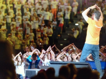 Dann ging es endlich in die Kölnarena und nicht nur die Kinder staunten über die Größe der Halle. Das Betreuungspersonal vor Ort brachte uns zu unseren Plätzen, die einfach optimal waren. Direkt in den ersten Reihen saßen wir nun - direkt gegenüber die mitgereisten Eltern und Verwandten. Plötzliche ging es los, das Licht wurde gedämmt und Gerd- Peter Münden, der Initiator der Aktion, trat auf eine kleine Bühne direkt vor uns und erklärte den Ablauf des Liederfestes.