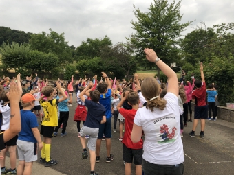 Niederbachem, 11.07.2019. Nach einem Aufwärmprogramm unter Leitung von Frau Svetlolobov ging es in 16 jahrgangsgemischten Gruppen an 16 Stationen. Diese waren in der Turnhalle, auf der Wiese oder auf dem Schulhof aufgebaut. Unter dem Motto „Olympiade der Tiere“ konnten die Kinder an den Stationen unter anderem krabbeln, wie ein Krebs, wie ein Adler fliegen, wie die Giraffe oder der Elefant laufen oder den Ball wie ein Seehund jonglieren.