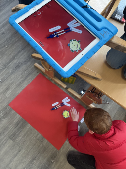 Und so läuft das bei uns ab: morgens wird unser Klassenzimmer also zum Filmstudio. Holzstühle werden zu Stativen umgebaut, indem wir Kabelbinder an den iPad-Hüllen befestigen. Es wird überall gefilmt, geschnitten, geschrieben und ausprobiert und Worte wie „Action“ und „Cut“ hört man aus jeder Ecke.