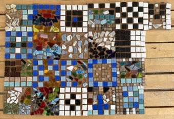 Wir haben da zusammen auf Holzplatten Mosaikscherben und Mosaiksteine geklebt. Alle Bilder sahen toll aus. Als wir damit fertig waren, sollten wir ein Mühlenbrett malen. Dazu haben wir auf dem Schulhof Steine für das Spiel gesammelt. Als wir damit fertig waren, sollten wir mit einem Partner Mühle spielen. Das Mühlenbrett und die Steine durften wir mit nach Hause nehmen.