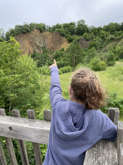 Auf dem Aussichtsturm haben wir uns den Steinbruch angeschaut. Wir haben dort auch etwas gegessen und im Anschluss haben wir die Straße überquert und sind den Eselsweg entlanggelaufen. Auf diesem haben die Menschen früher mit Eseln die Steine aus dem Steinbruch zum Bau des Kölner Doms nach Köln transportiert.