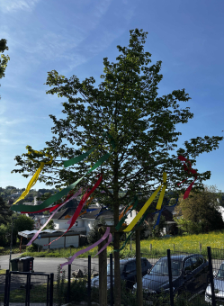 Niederbachem, 30.04.2025. Zunächst sangen alle gemeinsam "Nun will der Lenz uns grüßen". Die Klassensprecherinnen und Klassensprecher durften mit Hilfe unseres Hausmeisters den schönen Baum vor der Schulterrasse entsprechend schmücken. Währenddessen spielte Frau Heuer auf ihrem Akkordeon bekannte Mai-Lieder.