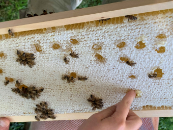 Niederbachem, 13.06.2025. Der Vater von Lara hat uns richtig viel über Bienen erzählt und uns seine Bienenstöcke gezeigt. Wir haben auch 2 tote Bienen und eine tote Hornisse angeschaut. Außerdem durften jeder von uns den frischesten Honig probieren, denn er war noch in einer Wabe, in die wir mit dem Finger hineinpieksen konnten. Dann gab es ein Quiz. Zum Schluss haben wir noch ein kleines Glas Honig geschenkt bekommen. Danach haben wir auf der Wiese im Garten gemütlich gefrühstückt, bis wir nach ca. 10 Minuten tschüss sagen mussten und wieder zur Schule gelaufen sind.