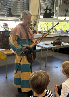 Während der zwei Schulstunden stellte Taravas den Kindern Instrumente aus dem Mittelalter vor, darunter den Dudelsack, die Drehleiher, die Tastenfiedel und das Krummhorn, die er alle zu spielen beherrscht.